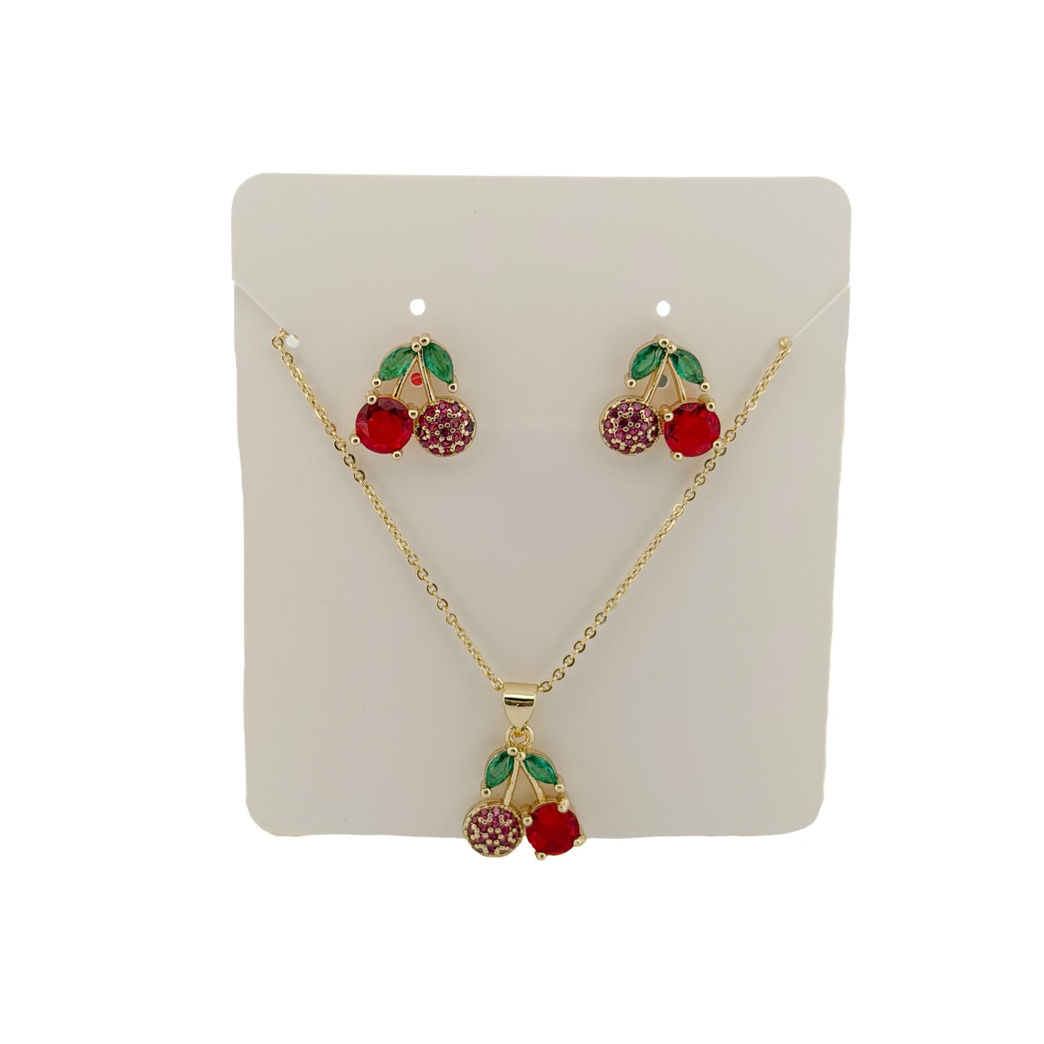 JUEGO ORO LAMINADO CEREZAS CON PIEDRA ROSA Y ROJA