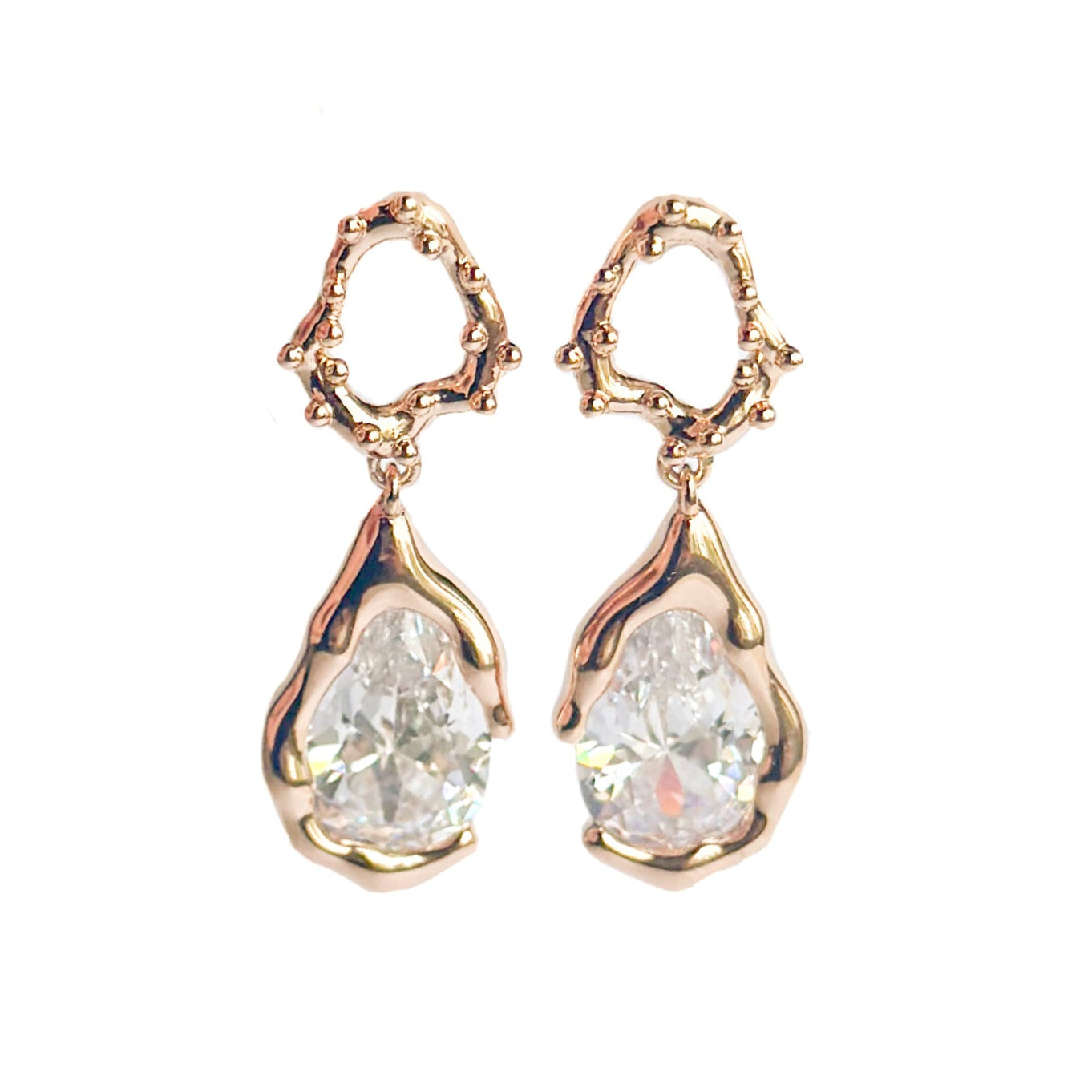 ARETE ORO LAMINADO 18K PIEDRA GOTA BLANCA COLGANTE