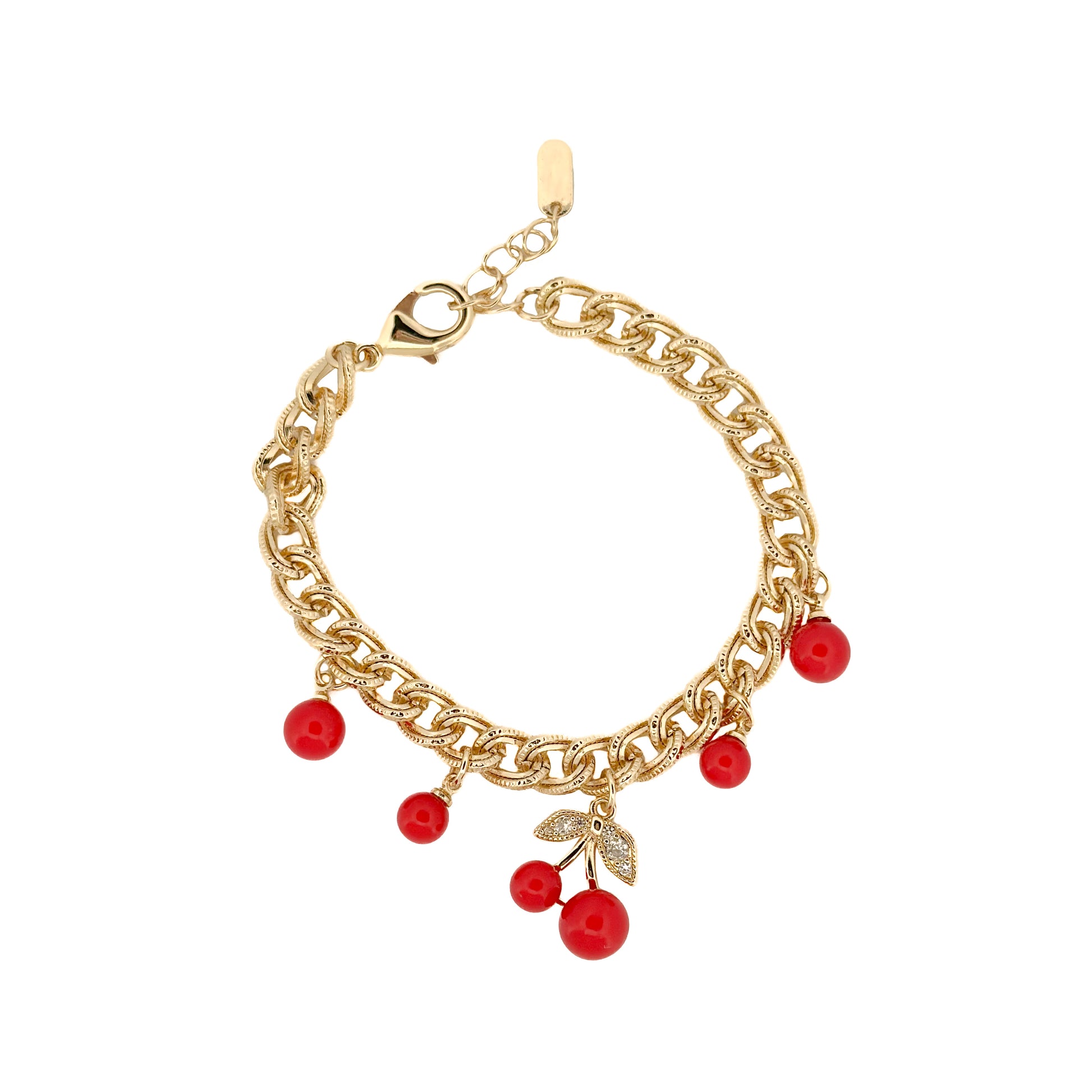 PULSO ORO LAMINADO CEREZAS ROJAS COLGANTES